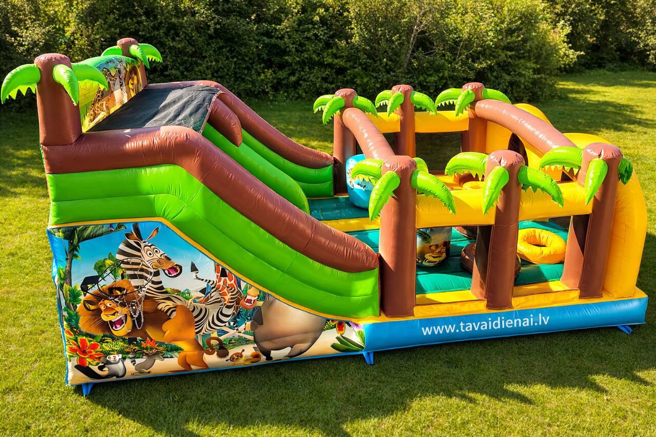Krāsaina un aizraujoša atrakcija ar šķēršļu zonu, lēkāšanas laukumu un aizraujošu nobraucienu! Bērni var kāpt, lēkt un šļūkt, izbaudot īstu džungļu piedzīvojumu drošā un jautrā vidē kopā ar Madagaskaras tēliem. Ideāli piemērota svētkiem, sporta dienām un privātām ballītēm – garantēta enerģija un smaidi visas dienas garumā!