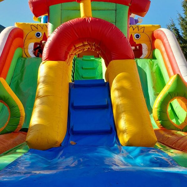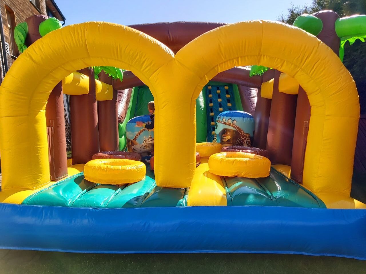 Krāsaina un aizraujoša atrakcija ar šķēršļu zonu, lēkāšanas laukumu un aizraujošu nobraucienu! Bērni var kāpt, lēkt un šļūkt, izbaudot īstu džungļu piedzīvojumu drošā un jautrā vidē kopā ar Madagaskaras tēliem. Ideāli piemērota svētkiem, sporta dienām un privātām ballītēm – garantēta enerģija un smaidi visas dienas garumā!